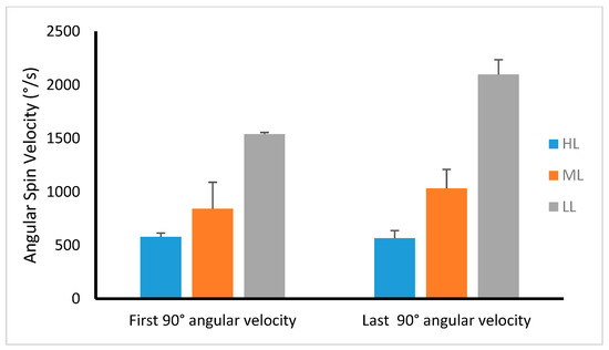 Figure 4 shows the skater’s strategy during the first 90° and last 90° of a jump’s spin. In the first phase, the HL reached an angular spin velocity of 579.43°/s, while in the final phase his velocity decreased at 566.34 °/s. Instead, the ML and LL show a higher angular spin velocity and a different strategy in both jumps’ phase compared to the HL. In fact, the ML and LL’s angular spin velocity at the landing show a higher velocity than the take-off phase.