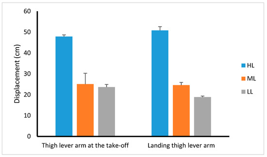 Considering the thigh lever arm measurement (coxo-femur/knee joints) at the take-off and landing phases (Figure 5), the HL at the take-off had 47.85 cm, while at the landing the HL increased his thigh lever arm at 50.80 cm. Differently, the ML and LL adopted the opposite behavior, increasing their thigh lever arm at the take-off, and landing with a reduced thigh lever arm.