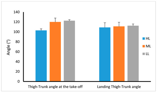 The consequence of the two different strategies observed for thigh lever arm measure is related to the thigh-trunk angle at the take-off and landing phases. In fact, as shown in Figure 6, the HL at the take-off had a thigh-trunk angle lower than in the landing phase, while the ML and LL had a greater angle at the take-off than in the landing phase.