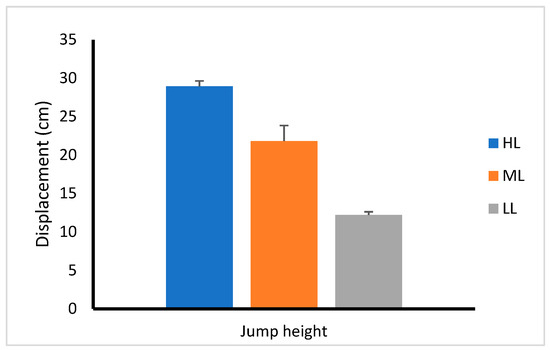 Figure 7 represents the vertical height reached during the double salchow for each athlete. The HL skater showed a greater vertical height (29.92 cm) than the ML (21.81 cm) and LL (12.21 cm).