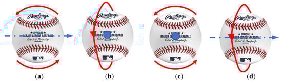 The direction of ball’s linear speed (blue arrow; a dot indicates that the ball goes into the page) and the direction of the spin (red arrow) for each orientation of the spin. (a) Four-seam back spin. (b) Two-seam back spin. (c) Four-seam gyro spin. (d) Two-seam gyro spin.