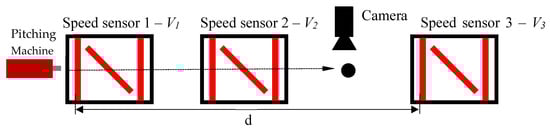 Arrangement of the pitching machine, speed sensors and camera to measure ball speed, rotation and location. The gate aligned vertically measured ball speed, while the angled gates measured position.