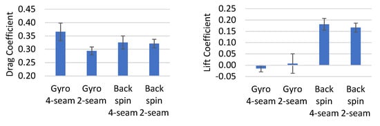 The average lift coefficient of the nine baseballs was measured to compare the difference between the spin orientations. As is shown in Figure 5, the two-seam and four-seam gyro spin had negligible Magnus force, where the average lift in the gyro orientations were 0.01 and −0.01, respectively. This was expected and agrees with other work [11]. The lift coefficient for the two-seam and four-seam back spin was 0.17 and 0.18, respectively. These results agreed with the lift coefficients from a previous study involving MLB (Major League Baseball) baseballs [12].