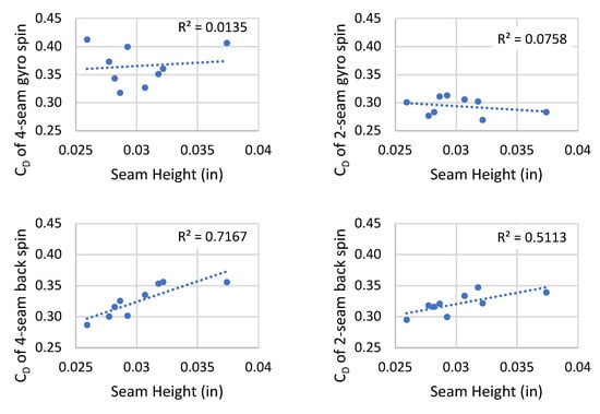 A dependence was observed between the seam height and the drag coefficient of back spinning baseballs (Figure 6). The strongest correlation was observed for baseballs with a four-seam back spin, with R2 = 0.72. For baseballs with a two-seam back spin, R2 = 0.51. The drag on baseballs with gyro spin showed little correlation with seam height, where R2 < 0.1.