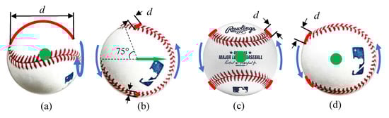 The seam exposure index for each orientation is listed in Table 1. For the four-seam back spin, as shown in Figure 7a, the length of the exposed seam is highlighted by red lines. Each seam is exposed twice (one on the top, one on the bottom) during each revolution. For the two-seam back spin, as shown in Figure 7b, the length of the exposed seam is the width of the seams. When the baseball is spinning in this orientation, about of the max flow air region does not have a seam. When that region is on the top or bottom, n = 2. Otherwise, n = 4. For the four-seam and two-seam gyro spin, as shown in Figure 7c, d, the length of the exposed seam is the width of the seams.