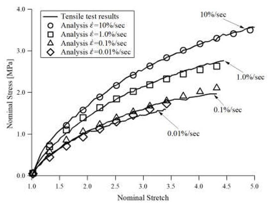 Now, let be the maximum value of over the past history up to the current time. Here, and are material parameters of the damage model. From the cyclic tensile loading test results, material parameters , and were determined as 0.555 MPa, −0.003 MPa, 0.22 MPa, respectively. The parameters of viscosity were determined as , , , respectively. Also, the parameters of damage model and were determined as 0.735 and 0.0243. The 2nd Piola-Kirchhoff stress is given by the partial derivative of with respect to the right Cauchy-Green tensor as follows: