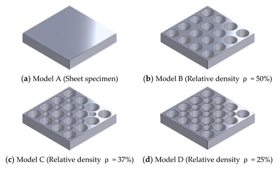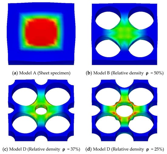 Drop weight impact testing method is the major method to investigate the dynamic properties of materials. It is also applicable to the TPEs in high strain rate [,,,]. This test method is good for obtaining the dynamic properties of materials but is difficult to use to obtain microscopic-deformation or stress-distribution of materials. Thus, four kind sof FEA models for the TPE specimens which have a periodical hole structure were prepared (Figure 3). Geometrical shapes of the specimens were determined while considering the impact loading test facilities by using a real baseball ball, as shown in Figure 4 []. The size of all the FE models was 50 mm × 50 mm × 8 mm. These specimens were developed to apply to the load-reduction material in the catcher’s chest protectors. The relative density of specimens A, B, C and D were 100%, 50%, 37% and 25%, respectively. The diameter of holes in the specimen B, C and D were just 10 mm, a set of 5 mm and 10 mm and a set of 7 mm and 10 mm, respectively. The boundary condition of FE analysis is shown in Figure 5. All nodes of bottom surface of specimens were constrained and nodes in the virtual baseball ball were also constrained to represent contact of the baseball ball to the TPE specimens. The number of elements of TPE specimens A, B, C and D were 2500, 2680, 2880 and 3240, respectively. The speed and diameter of the virtual baseball ball was assumed to be 0.8 mm/s and 74 mm, respectively. Displacement of 10 mm in the vertical direction was applied to the center of the virtual baseball ball under a quasi-static condition. Mean stress contributions of FE analysis are shown in Figure 6. Relationships between vertical load and displacement were shown in Figure 7. The simulated results were calculated under the viscous effect of the TPE which is shown in Figure 1 and Figure 2. The strain rate of all simulated results was 10%/s, which was same as the cyclic tensile loading test results shown in Figure 2. The speed of the virtual ball in the FEA was assumed to correspond to the same strain rate of cyclic tensile loading test shown in Figure 2, and differed from the drop weight impact test []. From the load-displacement relationships, stiffness reduction of the TPE specimens caused by the periodical holes were confirmed. From Figure 6, impact load reduction can be expected because the periodic hole structures cause deformation of the TPE.
