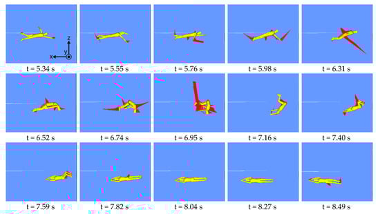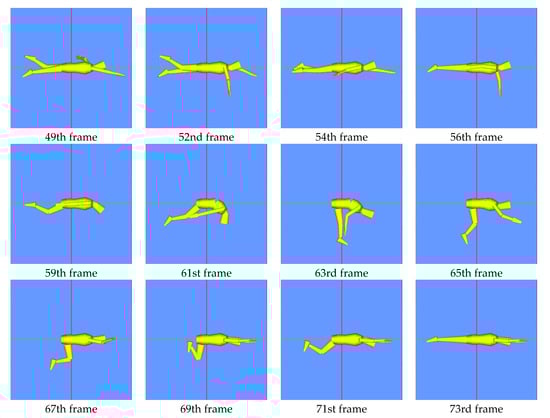 Swimmer’s joint motion was created based on the standard crawl motion made in previous research [] and a turn commentary video on the Internet []. In the created joint motion, the swimmer was supposed to perform three cycles of the crawl stroke first, then perform flip turn. One stroke cycle of the crawl was 1.96 s and was divided into 18 frames. In other words, the three crawl strokes were represented by 54 frames and the time per frame was 0.109 s. The time of the turn in the video was 8.6 s. This time was divided into 46 frames with the same time per frame as the crawl stroke part. For each time frame, the joint angles were determined using the still images, which were converted from the video. An operator compared the body positions in the images with those in simulation model on the computer screen, and adjusted the joint angles in the model so that both positions became consistent with each other. As a result, the joint motion consisted of 100 frames and the total time was 10.8 s. The created joint motion including flip turn is shown in Figure 1. The joint angles between time frames were automatically interpolated using the Spline function.