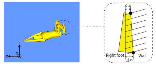 Modeling the contact with the wall during the turn is schematically shown in Figure 2. Four contact points were defined at the toes and heels of the swimmer model’s feet. An absolute coordinate system O-xyz, in which x and y are horizontal and z is vertical, was defined. The pool wall was represented as a plane where the x coordinate was a certain constant value. The contact force was assumed to be applied to the swimmer only when the x coordinate of each contact point exceeded the certain value. The exceeded amount, that is, the distance sunken in the wall, was defined as . The forces due to virtual spring and damper in the x direction perpendicular to the wall as well as the frictional force in the y and z directions were considered. The magnitude of the force by the spring is calculated from , and the magnitude of the force by the damper calculated from the time derivative of . The frictional force acts in the direction that hinders the velocity of each contact point in the y and z directions. The magnitude is determined by the force in the x direction. For example, the forces applied to the heel of the right foot in Figure 2 are represented as follows: