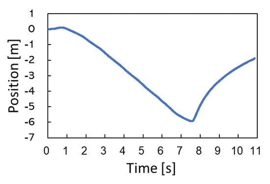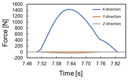 Table 1 shows the comparison results of the contact time, maximum force, and impulse obtained by the simulation with those measured experimentally in the previous research []. In the previous research, three national and international level male swimmers performed a minimum of seven turns, and the results were averaged. The comparison results indicate that three mechanical quantities obtained by the simulation were within the ranges of the previous research.