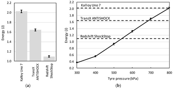 For comparison purposes, using the same methodology, the average total transmitted energy was also assessed for the front tyre pressure, ranging from 300 to 800 kPa with 100 kPa increments. This assessment was carried out for the Kalloy Uno 7 stem only.