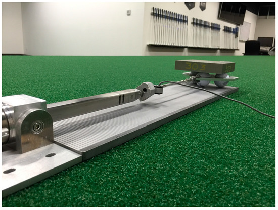 During the ball/surface impact under the sliding condition, the force of friction can be assumed to fair degree to be directly proportional to the normal applied load (Amonton’s Law). Thus, this behavior can be utilized to estimate the coefficient of friction between ball and surface. In order to get a better understanding of what reasonable values of the coefficient of friction might be between a golf ball and the surface of a golf club, an experiment was conducted where a sled of three golf balls was pulled across a plate with grooves and a blasted surface, characteristic of an iron-type golf club. A weight was placed on top of the sled while it was pulled across the plate at a constant speed. The force required one to pull the plate at a constant velocity was measured by a load cell (Transducer Techniques, MLP10, Temecula, CA, USA) placed in line with the pull motor and sled. This experiment was conducted for both a urethane-covered golf ball and a surlyn covered ball, and is depicted in Figure 2. The ratio of tangential and normal loads led to values of 0.4 and 0.35 for the urethane and surlyn covered balls, respectively. Although the loads in this experiment are much lower than those characteristic of a club-ball impact, the experiment provided insight into the rough magnitude of μ between a ball and club face.