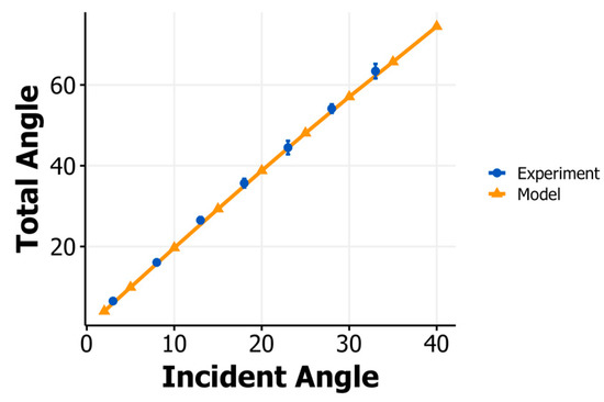 Total angle (incident angle plus outbound angle) vs. incident angle for experiment and model.