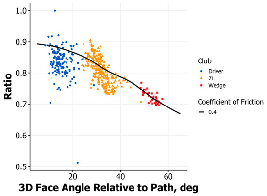 The experimentally measured launch ratios of a golf ball relative to the club face normal and club velocity for various club types have been successfully explained through the implementation of a modified Hertzian contact model. It has been shown that the dominant phenomenon that leads to the variation in launch ratio for different lofts is the compliant nature of the club–ball interaction. Even if the surface characteristics remain constant, the launch ratio will gradually decrease for increasing lofts for ranges of μ representative of dry contact. It is also shown how the behavior of the launch ratio for different club types and angles of incidence can be greatly influenced be the frictional characteristics of the surface.