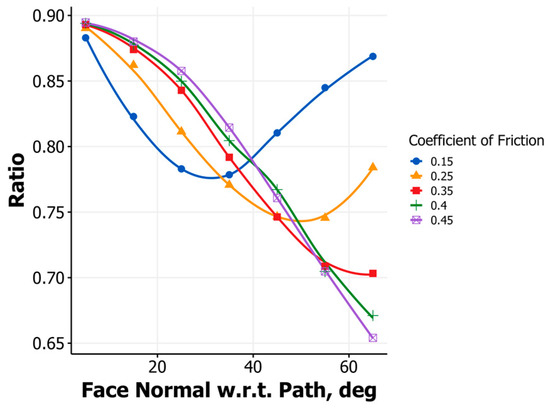 Launch direction ratio vs. face normal relative to club path for various coefficients of friction for an incident velocity of 80 mph.