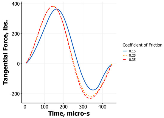 A major benefit of a model that captures the underlying physics and behavior at impact is that one can then evaluate different scenarios and gain insights into what is causing the results seen in experiments. Of particular interest is an explanation behind why the ratios change with loft. As mentioned earlier, it has been suggested that metal woods have a smoother face than irons, and therefore have different characteristic frictions between the face and the ball. This hypothesis can be explored by the model by evaluating the launch angle ratio over a range of incident angles and varying the value of μ. Figure 6 shows the results of such an analysis. Looking at the curves that are characteristic of dry clubhead surfaces (>0.3), it is clear from the model that the launch ratio monotonically decreases for increasing loft, even if the value of μ remains constant across the lofts. All ratios captured in Figure 6 are above 0.5, which means that the launch direction is closer to the direction of the face rather than the path. If any of these values were to fall below 0.5, that would mean the launch direction would be closer to the path. Furthermore, for angles that are characteristic of metal woods (i.e., less than 20°) the lowest coefficient of friction actually corresponds to a launch angle that is more closely aligned toward the path (i.e., lower launch ratio) than the higher coefficients of friction. This is at a glance counterintuitive and the opposite of some proposed hypotheses [4]. Why would a surface with a lower coefficient of friction lead to a lower launch ratio instead of a higher one? The theoretical model provides the ability to examine both the tangential force behavior occurring during impact and whether the areas of contact are slipping or are in stick at different points during the impact interval. The tangential forces for μ values of 0.15, 0.25, and 0.35 are presented in Figure 7. This figure not only displays the compliant nature of impact but shows how the higher coefficient values lead to a much higher “negative” tangential impulse. It is this negative impulse that brings the launch angle of the ball closer to the normal direction of the face. For the lower coefficient, the area of contact is actually in gross slip (i.e., entire contact area is slipping) for a short period of time before sticking, while for the two higher coefficients the contact area is in gross stick almost immediately at the instant of contact. This behavior also offers a possible explanation why the predicted launch ratio compared to the experimental for the driver in Figure 5 was over predicted by the model. It is possible that coefficient of friction may be less than 0.4 for the driver in the experiment leading to the lower launch ratio value. Looking at the higher lofts, or angles of incidence, there are some larger differences in launch ratio for the different values of μ. For the higher lofts, the initial part of the impact interval is characterized by gross slip, and for higher values of μ the contact area (in part or whole) transitions to stick. This behavior for the high values of μ leads to lower launch angles, while for lower values of μ the launch ratio is high (i.e., launch is closer to the face) since the contact surface is in gross slip during the entirety of contact. Lastly, when comparing the two sets of published values for launch ratio in Table 1, possible differences in contact friction can potentially explain the difference in empirically measured values.