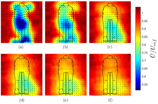 The time-average velocity color contour maps of the streamwise velocity (u) overlaid with projected velocity vectors in Y-Z planes behind the Monash cycling mannequin with the legs in the low drag (0°) position. Downstream locations are: (a) 0.63 m; (b) 1.26 m; (c) 2.52 m; (d) 3.78 m; (e) 5.04 m; and (f) 6.93 m.