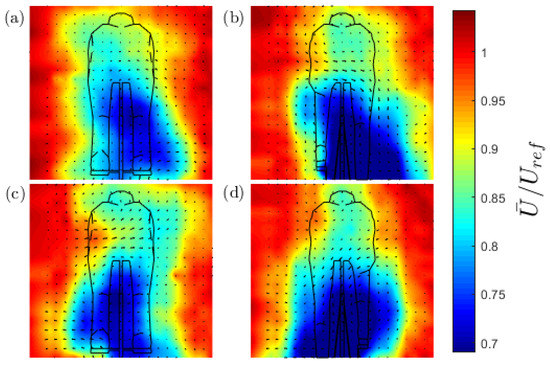 Measurements indicate that the development of the wake as it propagates downstream is consistent across four leg positions (0°, 90°, 180°, and 270°). Figure 3 displays contour maps of the streamwise velocity at 2.52 m behind the mannequin for all four leg positions. Figure 3a,b shows a stronger vortex shed off the right hip whilst Figure 3c,d shows the reverse [8]. It is evident that there is a trend for the wake to propagate towards the stronger vortex of the counter-rotating streamwise pair shed from the mannequin. In the two low-drag positions (0° and 180°), the wake tends towards the side of the leg positioned further upstream in the high drag positions (90° and 270°), there is a large downwash and sideways propagation towards the outstretched leg. This sideways wake propagation towards the side of the outstretched leg continues as the wake develops downstream.
