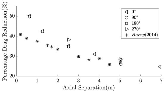 Percentage drag reduction (%) based upon the dynamic pressure difference for different axial separations of a trailing rider in the wake of the cycling mannequin for leg positions: 0°; 90°; 180°; 270°. The results obtained by Barry [4] are from direct force measurements of a trailing dynamic athlete in the wake of the Monash cycling mannequin with legs positioned at 15°.