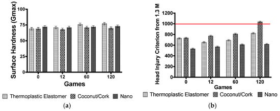As games increased the surface hardness increased for the TPE while coconut/cork and Nano remained stable. No differences were observed in coconut/cork and Nano throughout the study (Figure 1). A negative inverse relationship was found between surface hardness and infill depth. While all plots were below the ASTM standard of 265 Gmax and acceptable for play, differences were detected within that range.