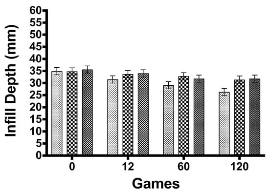 Infill depth of three alternative infills tested affected by the significant interaction of infill and games during 2017 in Knoxville, TN. Error bars represent standard error of the mean.