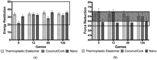 (a) Mean energy restitution values for three alternative infills at 0, 12, 65, and 120 games. Blue area represents FIFA 2 star ratings (b) Mean force reduction values for three alternative infills at 0, 12, 65, and 120 games. The colored area represents FIFA 1 star requirements while the diagonal area represents FIFA 2 start requirements. Both energy restitution and force reduction were collected using the triple a tester. Error bars represent standard error of the mean.