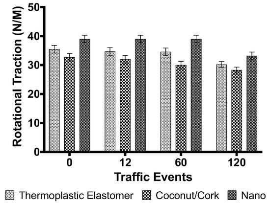 Energy restitution again showed the variability of the properties of infills. While differences exist, limited differences would be noticed due to meeting the FIFA 2 star rating. Force reduction demonstrated a similar trend as energy restitution. While Nano was low overall, it was still within FIFA 2 star requirements. The Nano infill provided the greatest rotational traction among the treatments. The superior performance of Nano was attributed to the particle size distribution. Nano infill had the greatest particle size diversity, which translated to the greatest amount of rotational traction. The coconut/cork mixture had the lowest rotational traction suggesting the inherent properties had a large impact on the result and coarse particles did not do as well for this test.