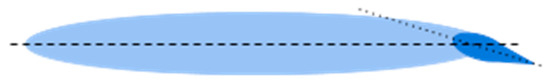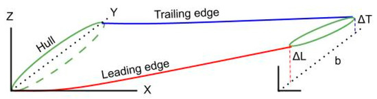 In composites it is possible to make the component twist when subjected to a bending moment [9]. This is achieved by having an asymmetric orientation of fibers—reinforcements on either side of the main bending axis. This way, the twisting of the centerboard may be maximized by adjusting the choice of laminate material and the orientation of the laminate plies. As a majority of the deformation consists of bending, a way of interpreting the twist angle from this deformation must be defined. The displacement along the z-axis of the leading and trailing edge are denoted as ΔL and ΔT, respectively (see Figure 3). The twist angle, α, is then defined as , where b is the centerboard chord (along the y-axis).