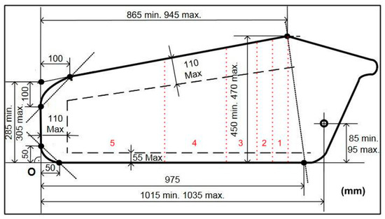Dimension constraints on the centerboard [3]. Red numbers and lines show the five sector partitioning described in Section 3.