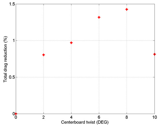 It is of interest to analyze how much the total drag could be reduced, considering no limitations on the internal structure, in order to evaluate the total effect from the deformed twist. This is done by carrying out a parametric twist study and comparing the parametric results with the deformed twist from ABAQUS. This study determines the reduced drag following the same calculation process as described in Section 4.1 where the reference side force for the interpolation is equal to the side force generated by the dingy using an original centerboard with a 5° leeway angle as presented in Table 3. The twist is considered linear with no bending from 0 to 10° within steps of 2° and the reduced drag is determined as shown in Figure 4. The study shows that the optimal twist is around 8° where the total drag is reduced by 1.42%. Figure 4 shows that more than half of the reduction in drag is obtained at 2° of twist and then the reduction speed slows down. After 8°, the drag on the centerboard increases more than the drag on the hull decreases. This results in a lower reduction of the total drag.