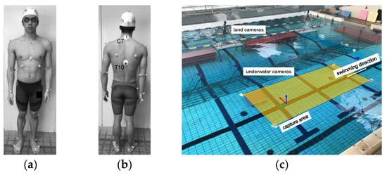 Thirty-four commercially available, spherical reflective markers (diameter 19 mm) purpose-built for underwater motion capture (Qualisys, Göteborg, Sweden) and two reflective tape markers were attached to each participant’s body (Figure 1a,b). The markers were attached to a flat magnetic base (diameter 10 mm, thickness 2 mm), which was attached to either the participant’s skin or his swimwear with adhesive waterproof tape. To minimize the disappearance of markers at the level of the water surface, which would be dead space between the dryland and underwater motion-capture volumes, markers C7 and T10 (Figure 1b) were reflective tape markers attached to the end of the rigid body of 7.0 mm and 10.0 mm, respectively. The buoys (100.0 × 50.0 × 49.2 mm; length × width × height) with three markers were floated on the water surface to detect the water surface (Figure 1c).