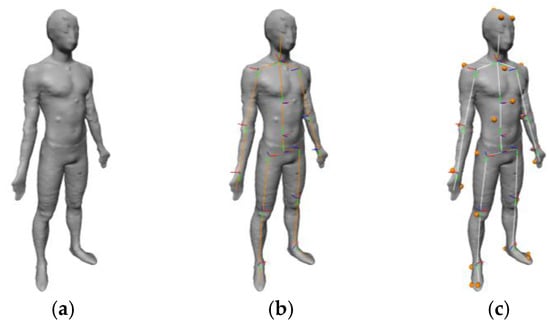 Process of individual model construction. (a) Import body shape data; (b) construct link segment model; (c) added feature points at the same positions as used for underwater motion-capture measurement.
