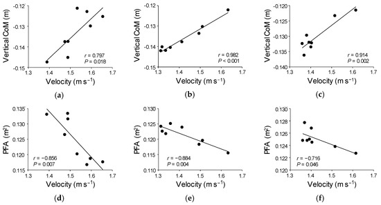 There were also significant correlations between swimming velocity and both vertical CoM position (|r| = 0.797–0.982, P = 0.001‒0.018) and PFA (|r| = 0.716–0.884, P = 0.004‒0.046) for each swimmer (Figure 4).