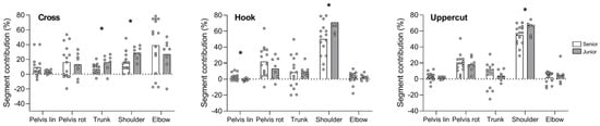Segments’ translation and rotation contributions (%) for the three punching techniques for the two groups of boxers. Segments’ contributions for trunk, shoulder and elbow are a combined translation and rotation. Bars represent mean values while white points represent individual data points. * denotes a significant difference between groups (p ≤ 0.05).