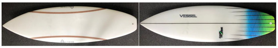 Two board identical in size were used for the test (Figure 1, Table 1). The boards measurements are 5′8″ in length, 19″ in width and 2.25″ in maximum thickness with the mass of the Alterego and Vessel surfboards 2.5 kg and 3.1 kg, respectively.