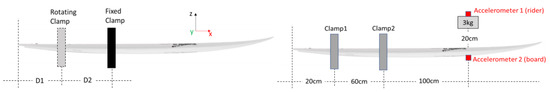 Board response via weight drop test: A weight with the measured weight of 3 kg is let fall on the board nose from a height of 20 cm simulating the front foot of a surfer landing on the board after an air maneuver or moving abruptly the front foot (Figure 2 right). In this test the board is clamped with D1 = 0.125 m and D2 = 0.4 m. Accelerations on the board and on the weight were recorded with two accelerometers (sampling frequency 100 Hz, Mbientlab, USA), with the results indicating the impact acceleration on the board and the rebound acceleration felt by the weight which should resemble the impact felt on the rider’s foot.