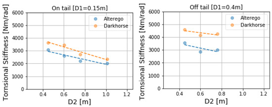 Torsional stiffness of the board for varying D2. (Left) On-tail configuration. (Right) Off-tail configuration. Dashed lines are power-law fits to the data.