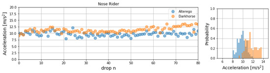 The weight drop test has the aim to evaluate how the board reacts when a weight is dropped on the board. 80 repetitions with a weight (3 kg) dropped from a height of 20 cm were performed for each board. The results from the accelerometers (Figure 4) indicate that the accelerations experienced by the Alterego are usually smaller and distributed over a narrower range (8–10 m/s2) compared to those experienced by the Darkhorse (range of 8–12 m/s2).