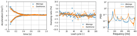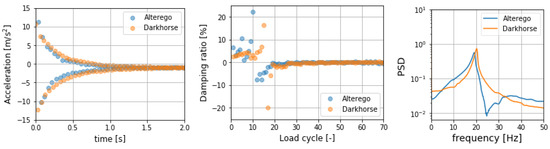 The results from the tail decay test (Table 3 and Figure 7) are in line with the other results presented in this paper. The Altergo board shows higher values of damping and generally lower frequencies compared to the Darkhorse (Figure 8). Three different peaks are visible from the power spectral density (PSD) plot shown in Figure 7 representing the three different flexural frequencies. The main natural frequency is located at 17 Hz. The average damping ratio is 3%.