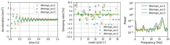 Results relative to tail decay test for the Alterego Board. (left) comparison of decay tests; (center) Damping ratio in each cycle; (right) Power Spectral Density and natural frequencies.