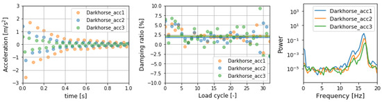 Comparative results from free decay test. (left) comparison of decay tests; (center) Damping ratio in each cycle; (right) PSD Power Spectral Density and natural frequencies.