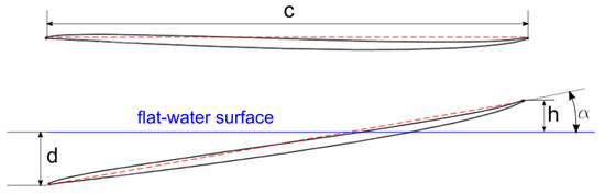 To perform a parametric study about forces and moments acting on the surfboard at different attitudes, we univocally defined some geometrical parameters, some concerning the surfboard geometry, such as, for example, its length, its maximum width and its maximum thickness, and others related to the attitude, such as the angle of attack, the depth of submersion and/or the height of surfacing of the nose tip. Surfboards are symmetric with respect to the centerline plane, so we used the “profile” of the surfboard, that is the butt line given by the intersection of the surfboard with the centerline plane, to define the “chord” of the surfboard. This is illustrated in Figure 1, where we show that the chord of the surfboard is the segment that joins the leading edge and the trailing edge of the profile, that is the fore and aft points of maximum curvature, respectively. Using such a definition, the chord length, c, normally coincides with the maximum longitudinal extension of the surfboard. For the purpose of this paper, we could define the angle of attack (also AOA, or α) simply as the angle formed by the chord and the flat-water surface. In realistic situations, when the surfboard planes on a curved and inclined wave, such a definition will have to be generalized in a different way. Finally, we could use the distance of the surfboard’s nose from the water plane, h, as the independent parameter that also dictates the length of the submerged portion of the chord and the depth of submersion of the tail, d, that is the distance between the tail and the flat-water surface. The chord of the surfboard that we used in this work was equal to 1.904 m.