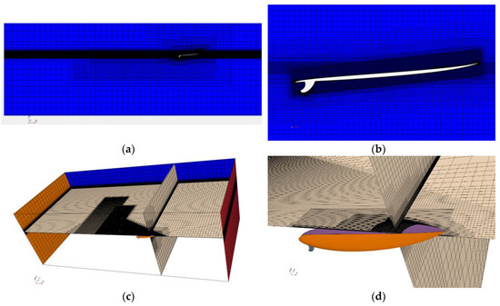The computational mesh; (a) complete view at the symmetry plane; (b) zoomed view at the symmetry plane near the surfboard; (c) complete view of the computational domain; (d) mesh details near the surfboard.