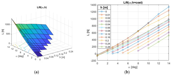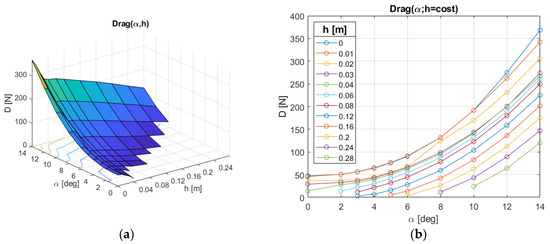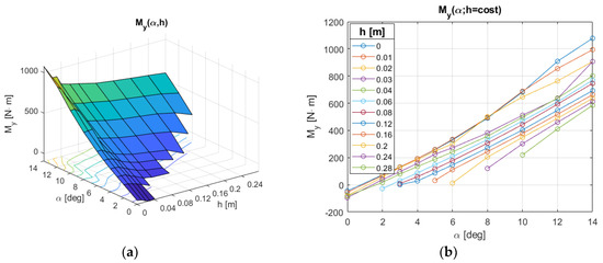 We carried out a systematic analysis about forces and moments on the considered surfboard at different attitudes and speeds. The initial conditions were uniform velocity and pressure (with values identical to the inflow condition) for both water and air, and a flat water/air interface. Then, the simulation evolved in time for at least 10 s, but in some cases the final time was extended up to 20 s to obtain constant mean values of the hydrodynamic forces. The angle of attack, α, varied from 0° to 12° with a 2° step, and the surfacing height of the tip, h, changed from 0 to 8 cm with a 2 cm step, and from 8 to 24 cm with a 4 cm step. Some (h,α) couples, in particular those with a large h in combination with a small α, have not been simulated because they would result in unphysical configurations (flying surfboard). The final solutions were weakly unsteady, with oscillations of about 1% in the magnitude of forces and moments. We defined as lift, L, and drag, D, the forces normal to the flat-water surface and parallel to the velocity vector, respectively. Since these forces lay on the x-z plane, we only calculated the moment about the y-axis, My with respect to the surfboard tip. For conciseness, only data concerning a speed of 6 m/s are shown here in Figure 3, Figure 4 and Figure 5. Note that the values refer to half the surfboard, so they must be multiplied by two to obtain the correct magnitude. As expected, forces and moments tend to increase as the angle of attack increases and as the tip surfacing height .