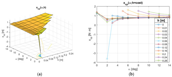 where and represent the position of the center of gravity along and above the chord, respectively, and T is the traction force in the x-direction that must equilibrate the drag. For simplicity, we assumed that traction was applied at the center of gravity, as it could be done in a towing experiment. In our case, we have 1.018 m and 0.02938 m. Given a certain external force , for each couple (h,α) a position may exist that ensures static equilibrium. Clearly, not all combinations are valid since some may not fulfill Equation (1a), or may fall outside the surfboard. In Figure 7a we show different static equilibrium positions for two different external forces corresponding to surfer weights of 50 kgf and 70 kgf, respectively. The plots have been obtained interpolating the functions D(h,α), L(h,α) and My(h,α) to increase the data resolution. The available equilibrium positions cover a belt in the (h,α) plane and range from about 0.74 m to 1.25 m from the surfboard tip. These are stable static equilibrium conditions, as we verified calculating the eigenvalues of the Jacobian matrix of Equations (1a) and (1b). One example of the wave system around the surfboard for a given equilibrium condition is shown in Figure 7b. It corresponds to an external weight of 70 kgf placed at x = 0.85 cm from the surfboard tip. The iso-surface corresponds to a water fraction equal to 0.5 that roughly corresponds to the air/water interface. Superimposed colors indicate the height with respect to the flat-water level.