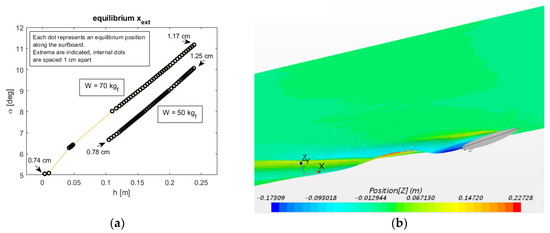 (a) Equilibrium positions for external forces of 50 and 70 kgf (dots indicate force position with spacing of 1 cm between indicated extrema; (b) surfboard and air/water interface for one equilibrium state (colors indicate the height with respect to the flat water level, only the computed half-domain is shown).