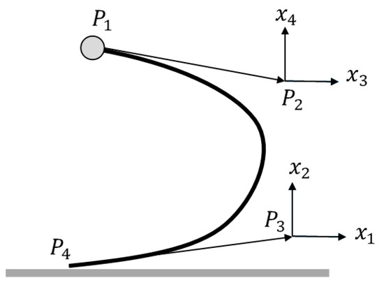 For optimizing the shape of a prosthesis, several steps are followed in order to create shape, to create a finite element model, to adjust thickness, and to formulate the optimization problem. First, the shape of prosthesis is created by using B-splines with four points, as shown in Figure 1. The positions of two of the points—on top, point and on the bottom, point —are fixed, and the positions of the remaining two points, and , are considered design variables. Then, equidistant points are created on the B-spline to model nodes and elements of the finite element model. The material of the prosthesis is assumed to be isotropic with a density of 1500 kg/m3, an elastic modulus of 120 GPa, and a Poisson’s ratio of 0.3. Sectional properties of the prosthesis are assumed to be the same for all elements. While the width is constant, the thickness changes through the thickness adaptation process. The upper tip of the prosthesis, point , is allowed to move in the vertical direction, whereas the other directions are fixed. Ground contact is modeled as frictionless in order to understand the behavior of the prosthesis through different contact zones by allowing sliding to easily occur.