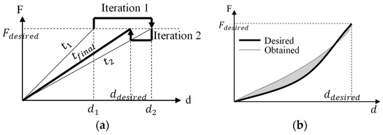 (a) Process of thickness adaptation through thickness adaptation on the force-displacement curve. (b) Desired and obtained force-displacement curve. The hatched area shows error.