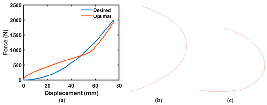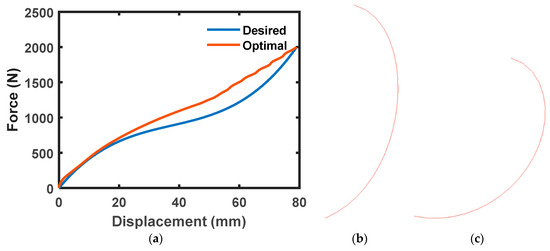 (a) Force-displacement characteristics of the prosthesis with stepy characteristics. (b) Initial shape of the optimized prosthesis with stepy characteristics. (c) Deformed shape of the optimized prosthesis with stepy characteristics under force 2000 N.