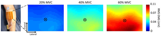 Mean topographic maps of medial gastrocnemius activity at different contraction intensities (N = 12), presented with their respective barycenter. The maps (32 × 28 pixels) were created from the 56 root mean square (RMS) values using an interpolation factor of 4. The reference system at the bottom left corner of the image represents an example of the origin of each image (0,0), from where the barycenter (crossed black circle) coordinates were calculated.